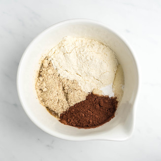 Dans un saladier ou dans la cuve de votre robot, versez les oeufs, le sucre et le miel, fouettez jusqu'à ce que les oeufs blanchisse et obtiennent une texture mousseuse. Ajouter ensuite les ingrédients secs, la poudre d'amande, la farine, le cacao et la levure. Fouettez à nouveau.
