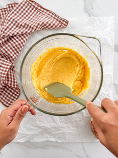 Une fois la crème et la purée de potimarron, versez la farine, la levure chimique et la pincée de sel, mélangez jusqu'à obtenir une pâte comme celle ci.