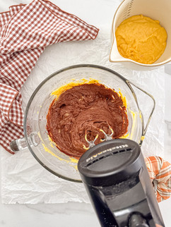 Diviser la pâte en deux et dans la première versez le chocolat fondu et mélangez afin qu'elle soit complètement homogène.